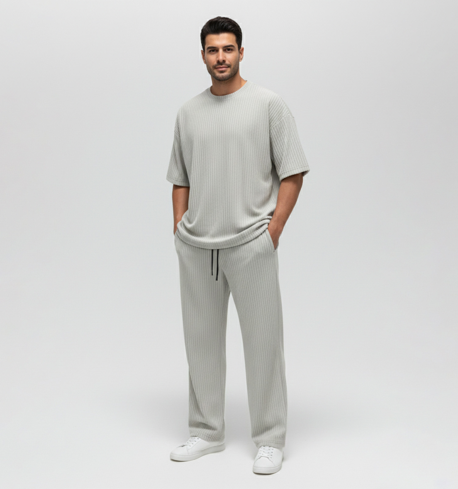 ست مردانه تیشرت و شلوار طوسی پارچه کبریتی
